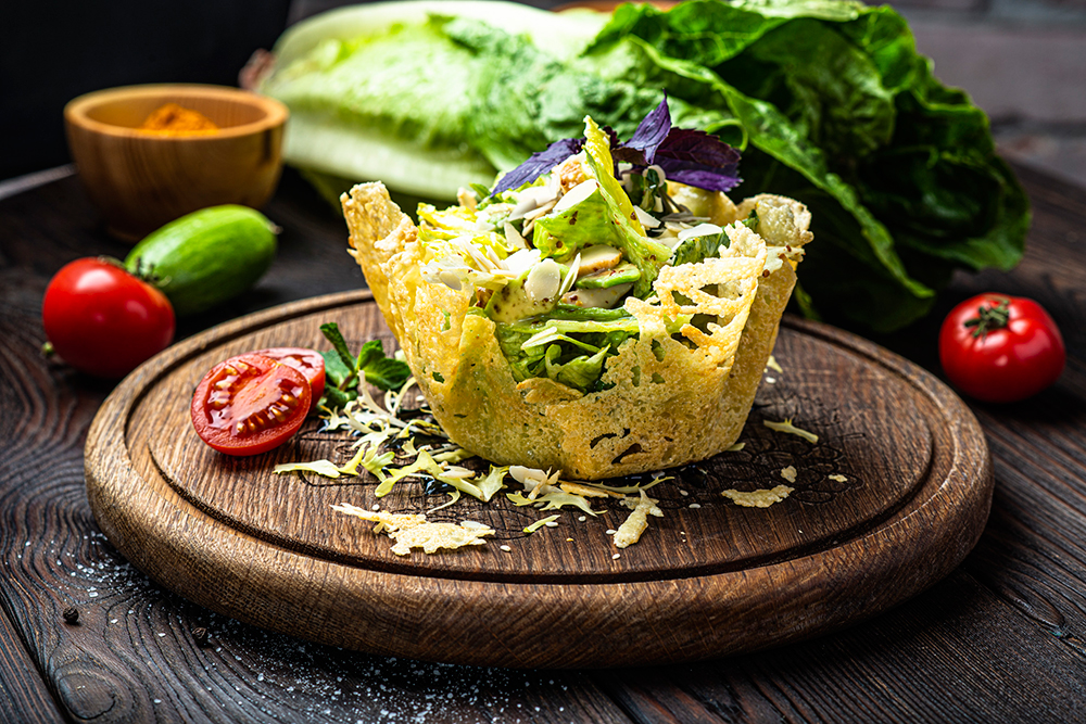 куриная грудка, ананас, авокадо, листья салата, в сырной корзине под медово-горчичным соусом с миндальной стружкой