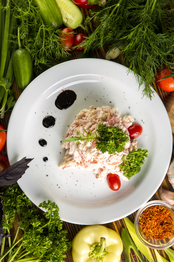 куриное филе, телятина, огурцы сол., перец болг., шампиньоны, лук репка, майонез