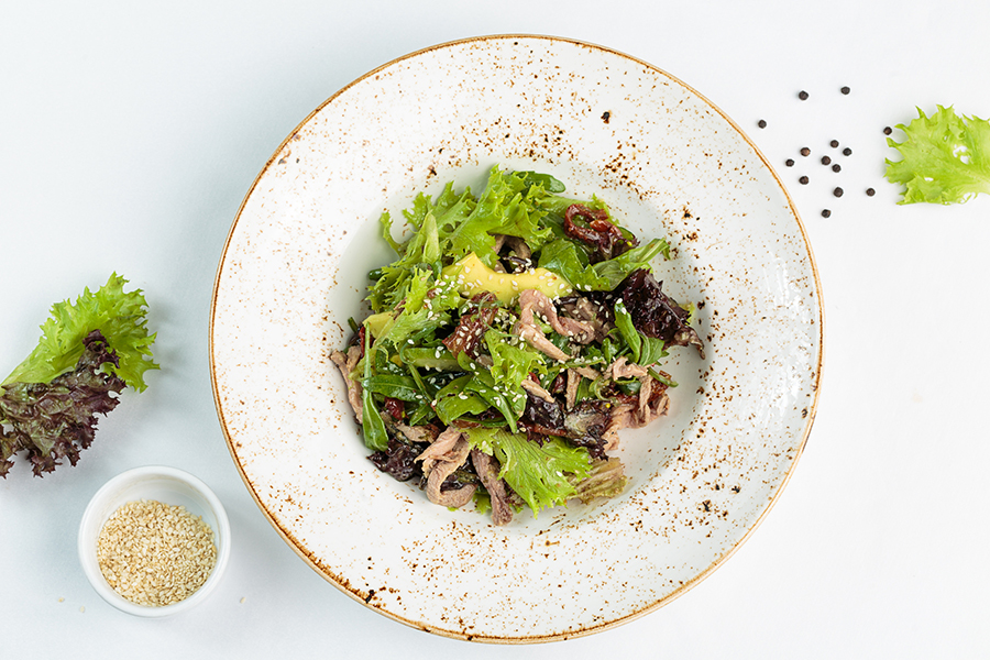 листья салата, помидоры вяленые, огурцы, салат чука, под медово-имбирным соусом, авкокадо